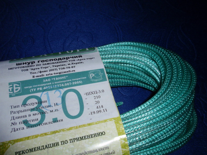 Шнуры хозяйственные с полимерным покрытием представляют собой шнуры плетеные из синтетических нитей белого цвета (условное обозначение - ШХ) и цветных (условное обозначение - ШХЦ), покрытые пластикатом. Диаметр шнуров хозяйственных с полимерным покрытием - 3.0 - 8.0 мм. Максимальное временное сопротивление усилию на разрыв – 210 – 510 Н.